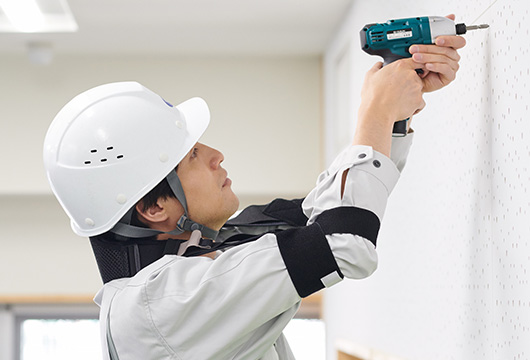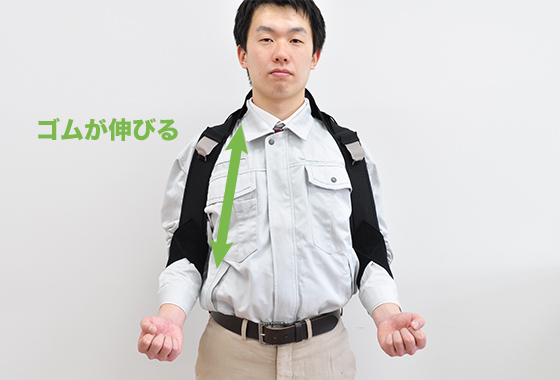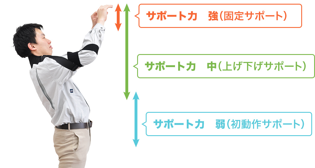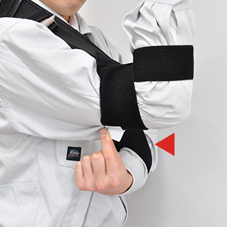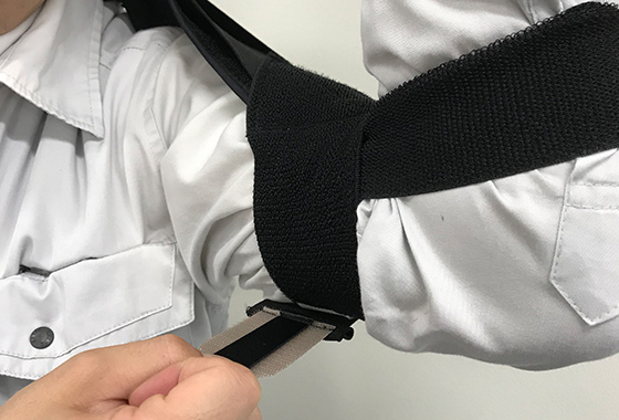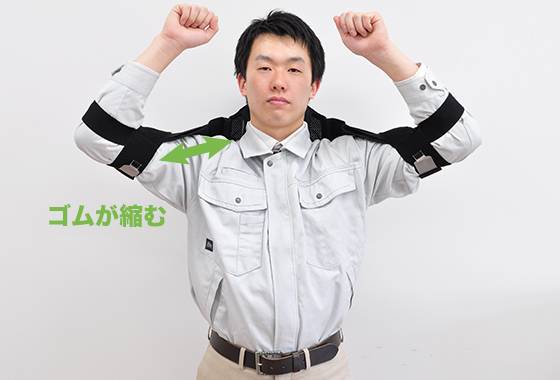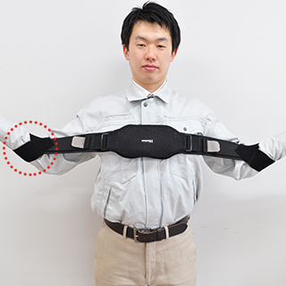 Attaching the adjustment belt near the elbow provides moderate support. Recommended for repetitive work in the range from chest height to above the head. It makes it easier to raise your arms by taking advantage of the stretching force of the rubber.