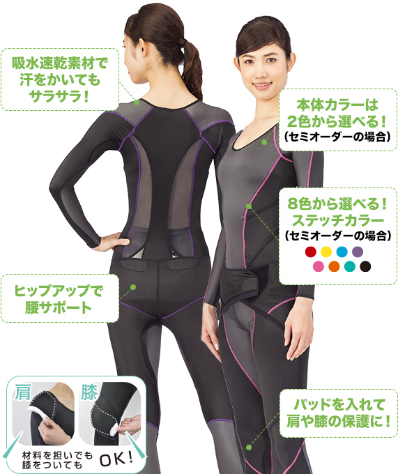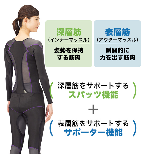 By combining the function of spats to support deep muscles (inner muscles) with the function of supporters to support outer muscles (outer muscles), it supports the body from inside and outside.