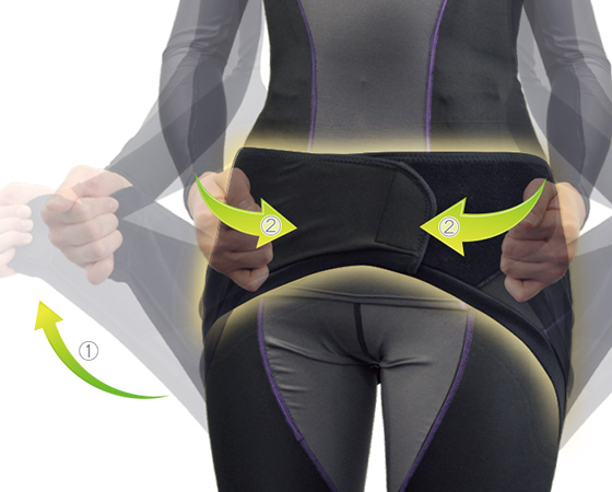 Tightens from the back of the thigh to the abdomen to stabilize the pelvis, leading to correct posture and stabilizing the lower back. The strength of the compression can be adjusted with hook and loop fasteners.